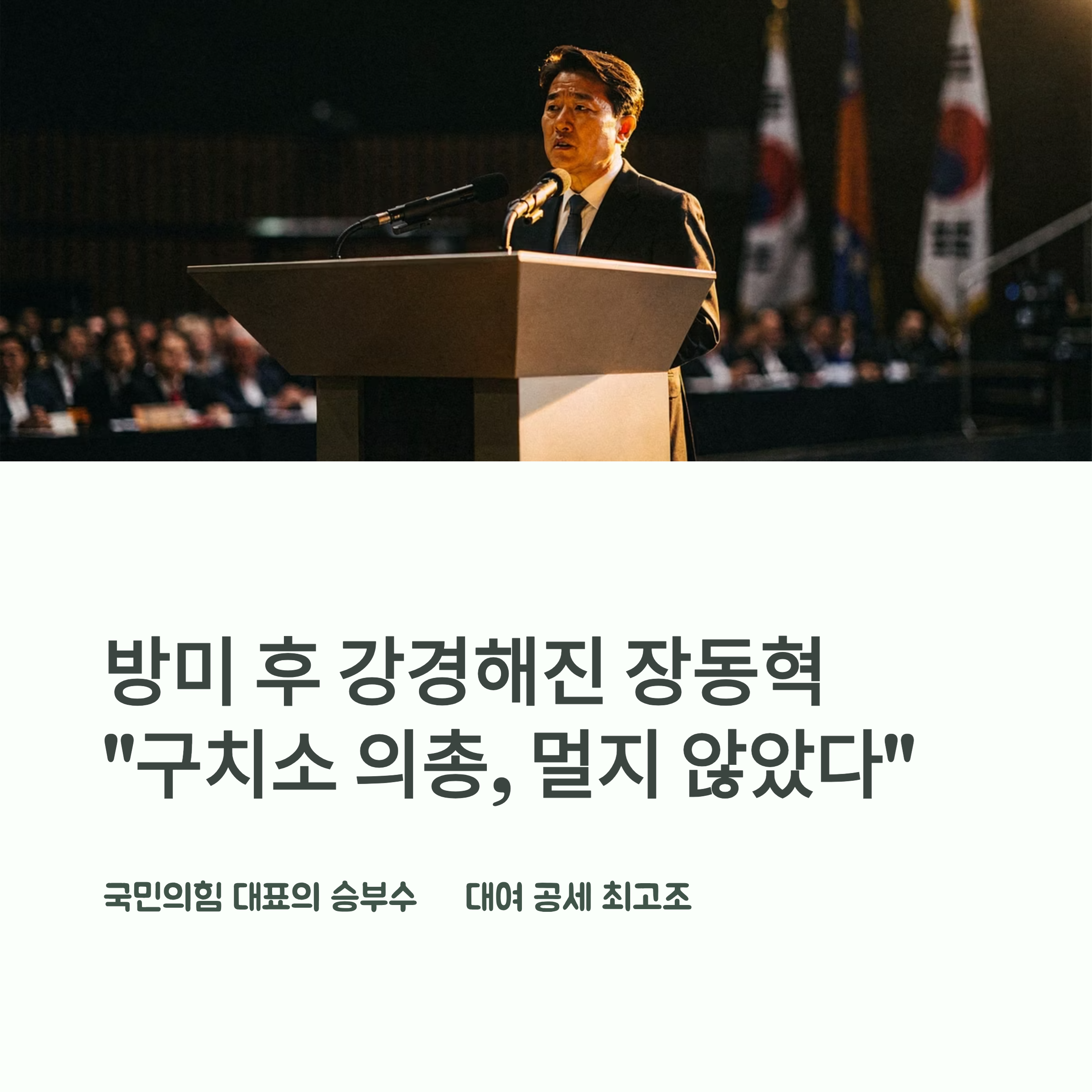 장동혁 국민의힘 대표가 미국 방문 이후 한층 강경해진 발언으로 정국의 중심에 섰습니다. 그는 이재명 더불어민주당 대표를 향해 "구치소에서 의원총회를 여는 날이 머지않아 올 것"이라며 사법 리스크를 정조준했고, 당내 비판 세력에는 "해당 행위 시 후보를 즉시 교체하겠다"는 초강경 카드를 꺼내 들었습니다. 이는 과거 중도 확장을 위해 내부 비판에 다소 유화적이던 모습과는 확연히 달라진 태도입니다. 본문에서는 장 대표의 발언 수위가 높아진 배경과 당내 중진과의 갈등 양상, 그리고 이를 통해 엿볼 수 있는 국민의힘의 향후 전략 변화를 심층적으로 분석하겠습니다.