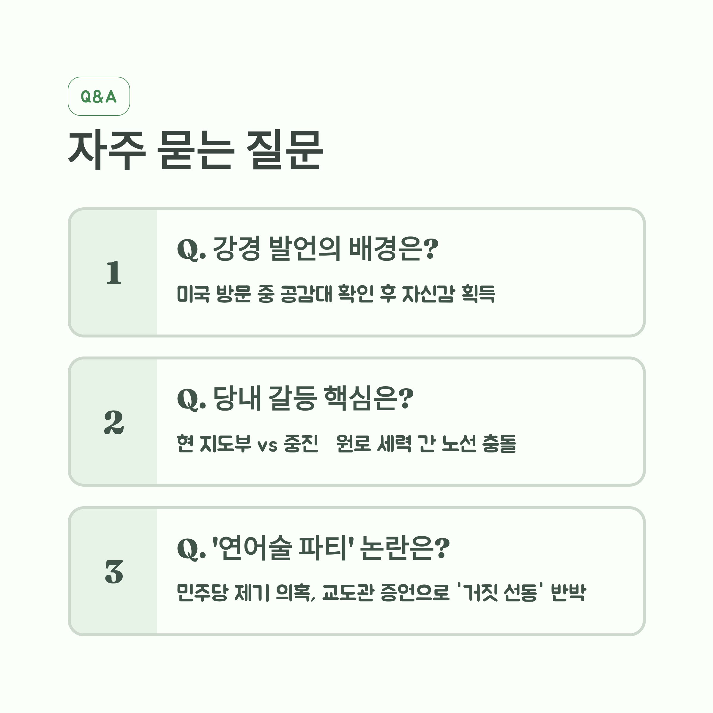 | Q. 국민의힘 내부 갈등의 핵심은 무엇인가요? |