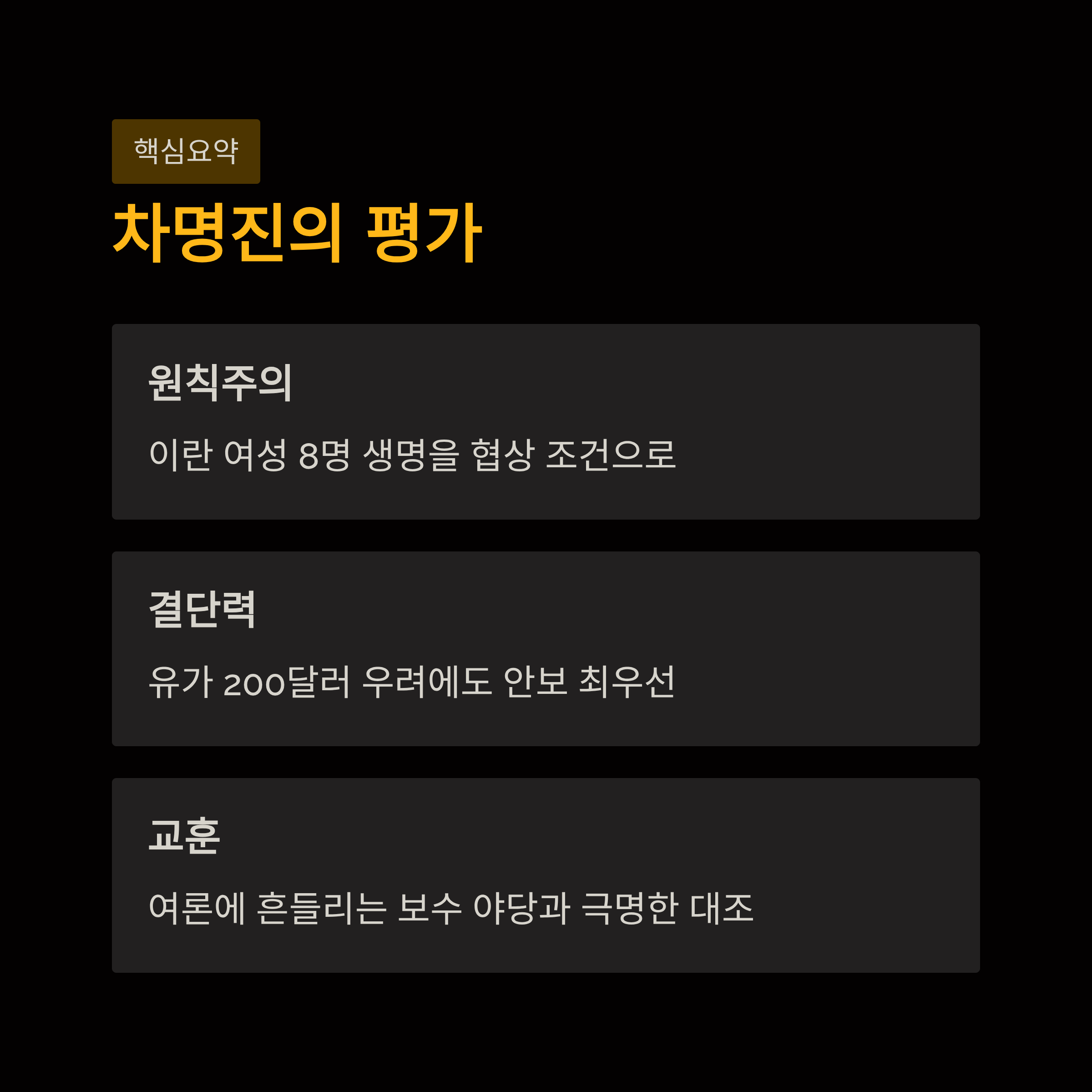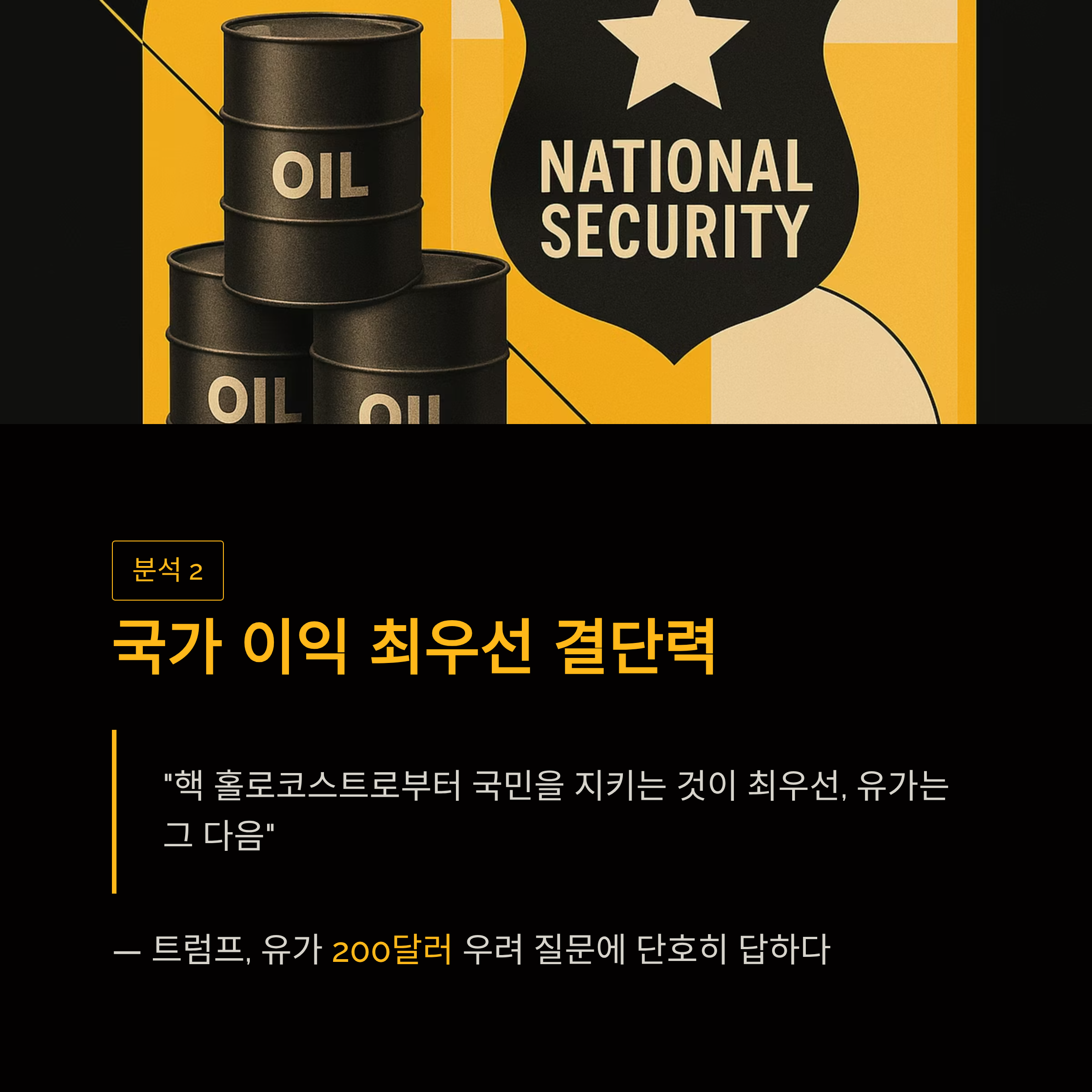 둘째, 유가 200달러 우려에도 불구하고 이란의 핵 위협으로부터 국민을 지키는 것이 최우선이라며 국가 이익을 우선하는 결단력을 증명했습니다.