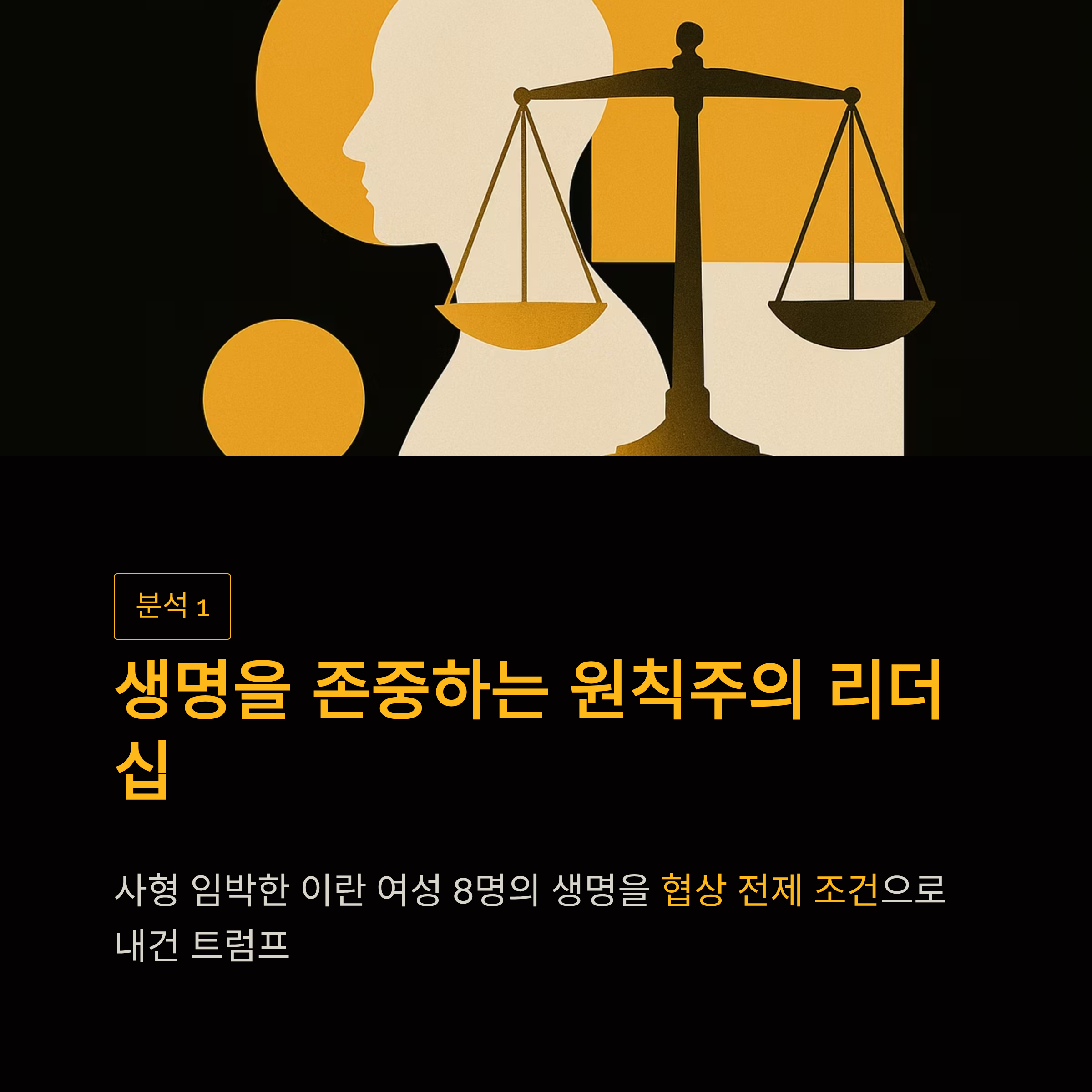 첫째, 트럼프는 사형 위기 이란 여성 8명의 생명을 협상 조건으로 내걸며 생명을 존중하는 원칙주의 리더십을 보여주었습니다.