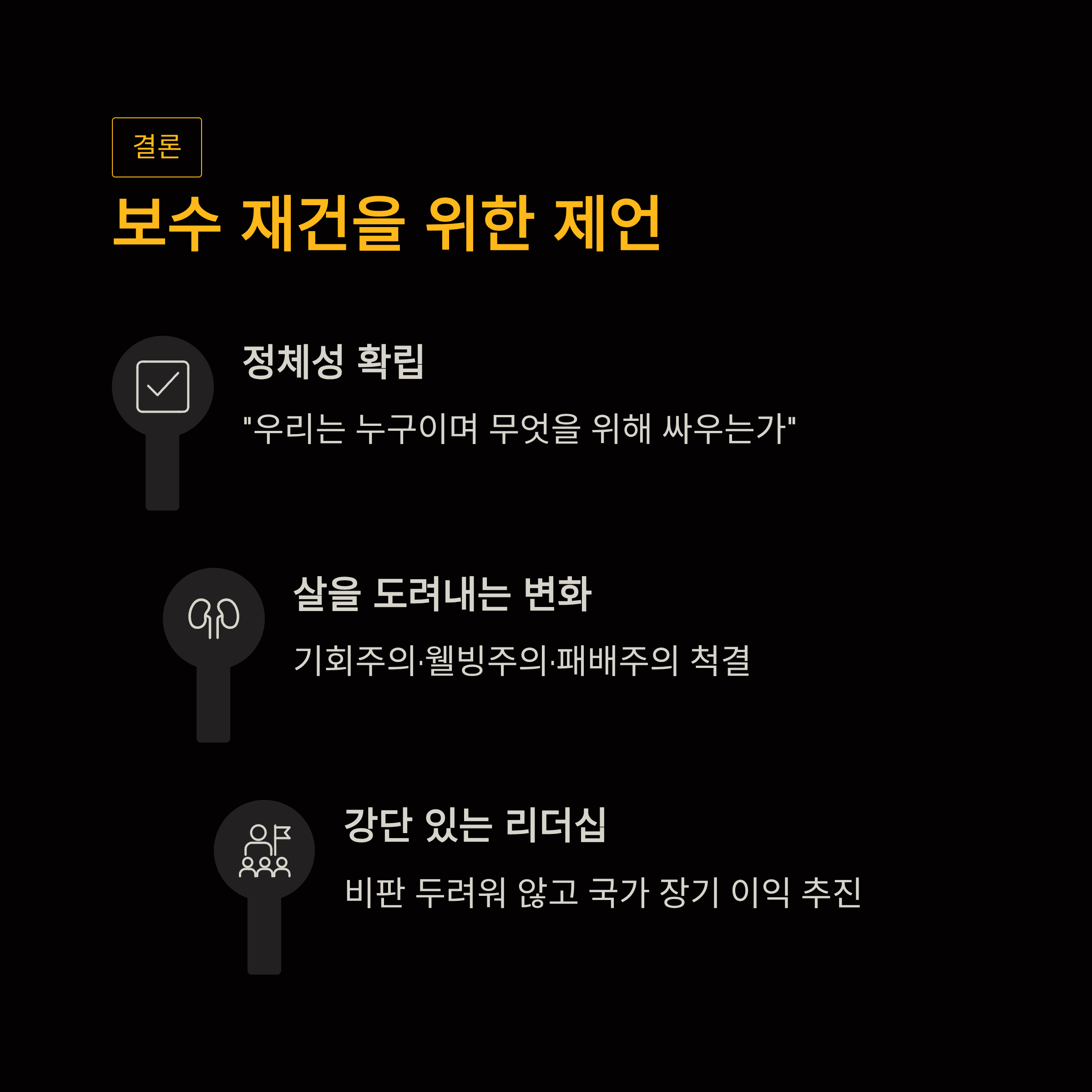 결론적으로, 내부 기회주의와 패배주의에 빠진 국민의힘이 재건하기 위해서는 트럼프와 같은 강단과 분명한 목표 의식을 갖추는 것이 핵심 과제라고 강조합니다.