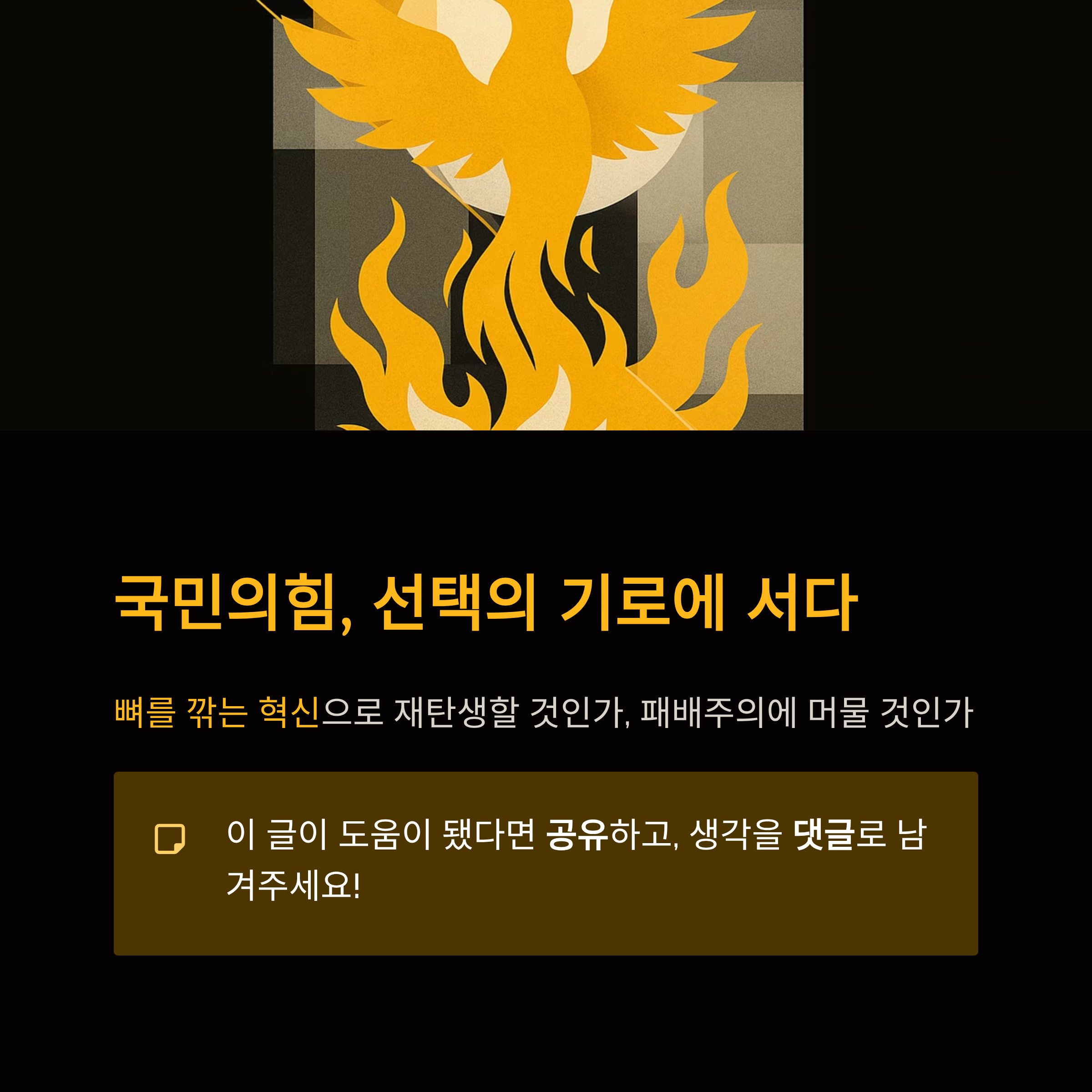 | A. 단순한 선거 승리를 넘어, 내부의 기회주의와 패배주의를 척결하고 확고한 원칙과 비전을 세우는 근본적인 혁신을 요구합니다. 새로운 리더십과 프레임으로 보수 진영이 재건되어야 한다고 말합니다. |