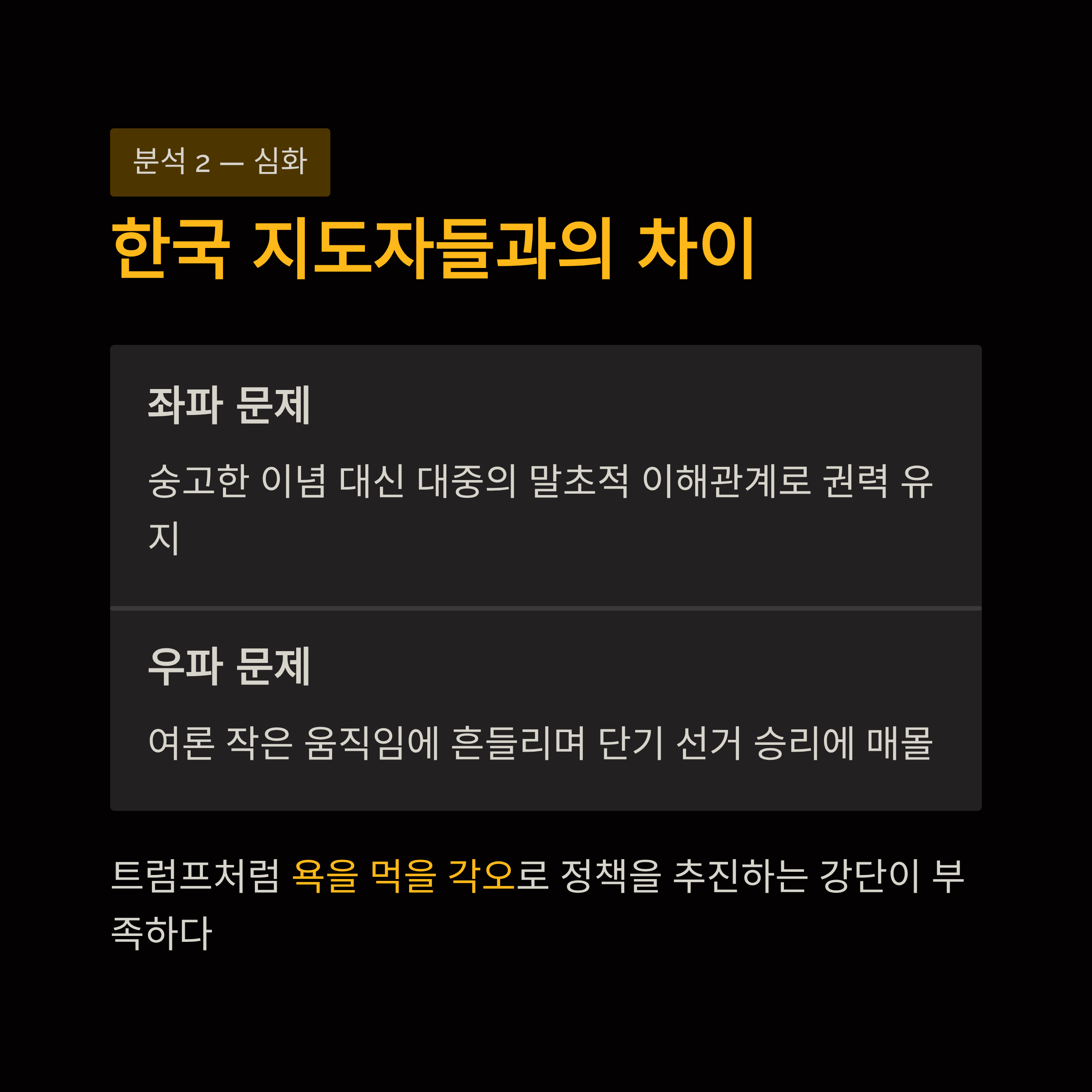 - 핵심요약: 트럼프 리더십과 한국 보수 야당의 과제