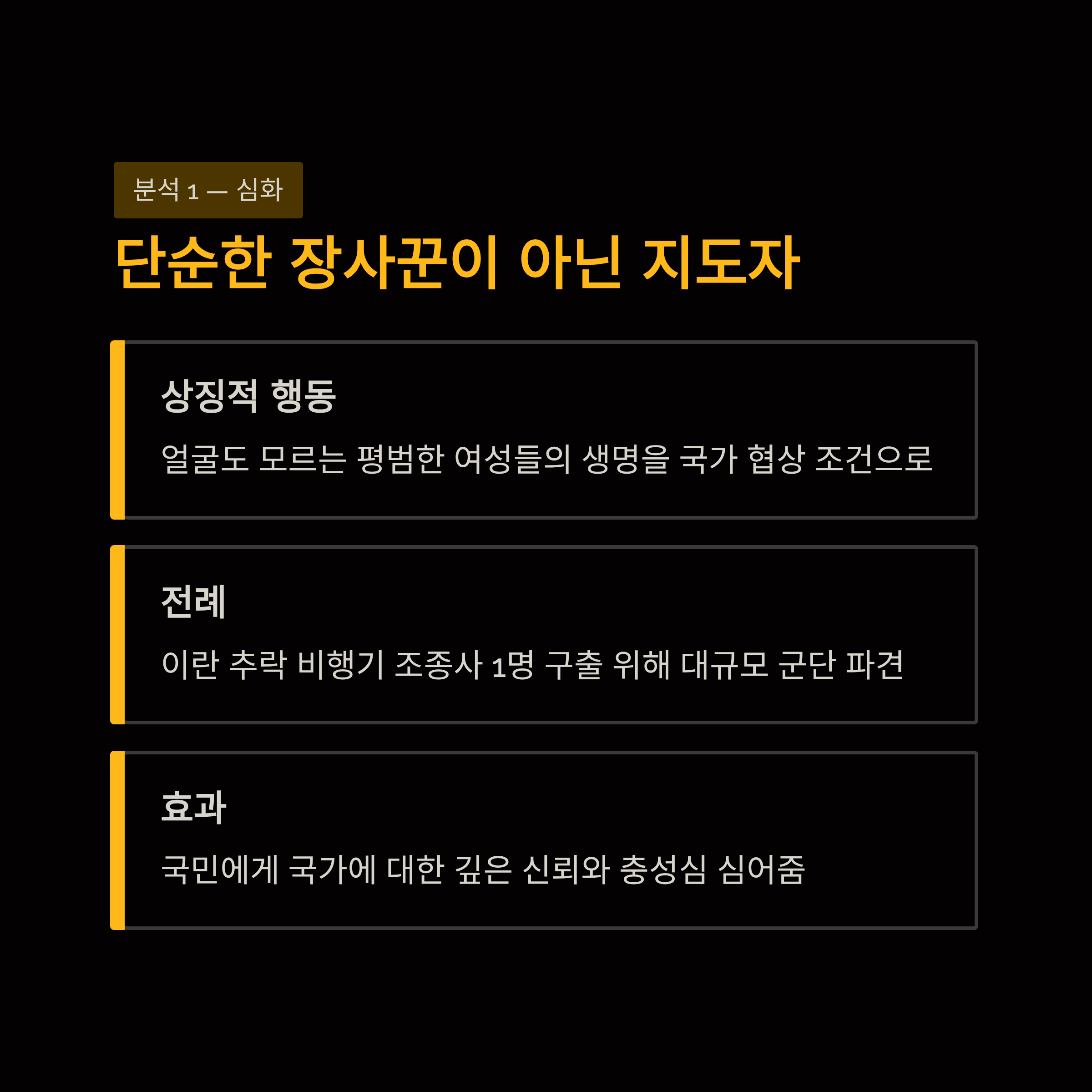 | A. 이란 여성 8명의 생명을 협상 조건으로 내건 '생명 존중'의 원칙과 유가 급등 우려에도 국가 안보를 최우선으로 한 '결단력' 때문입니다. 그는 이를 진정한 지도자의 모습이라고 평가했습니다. |